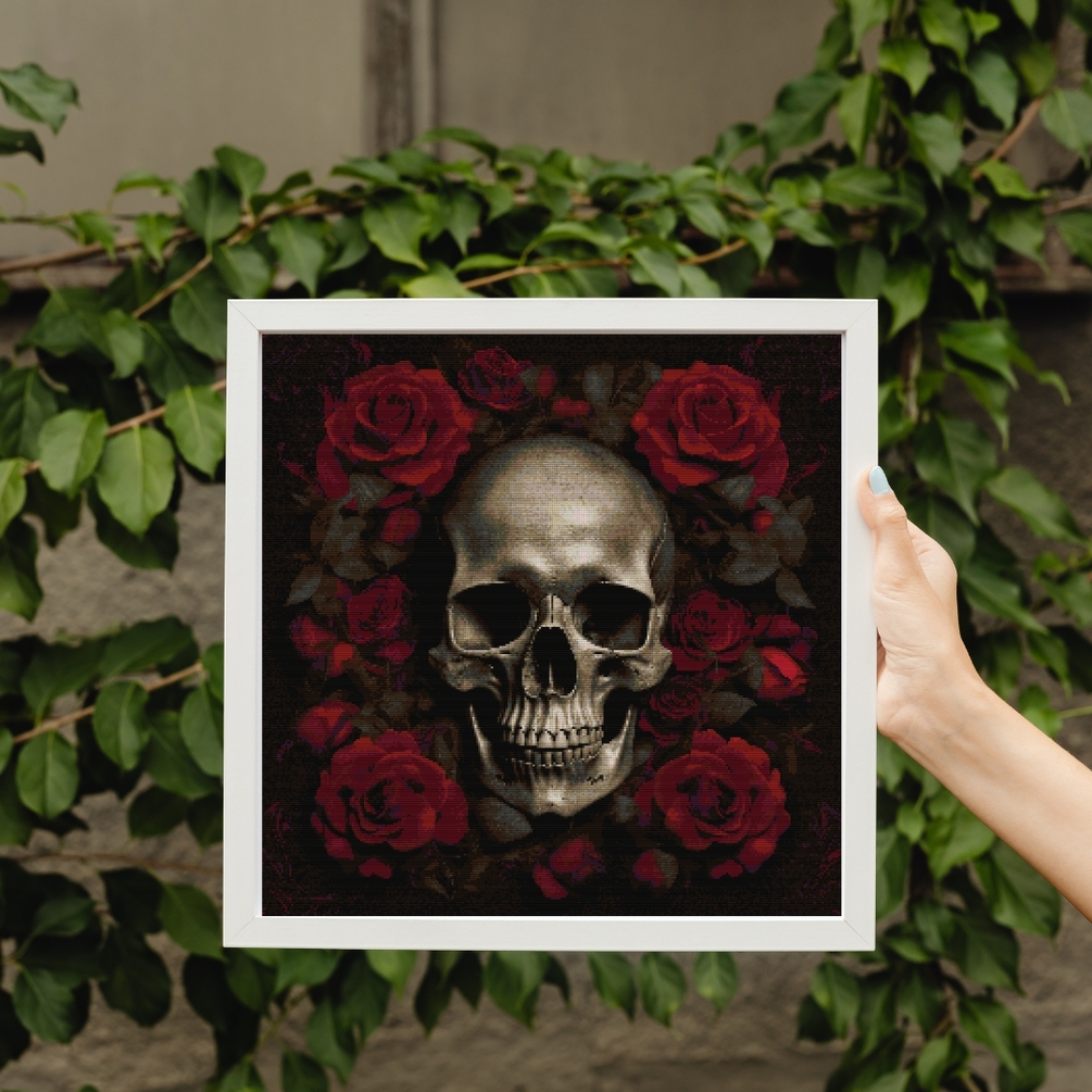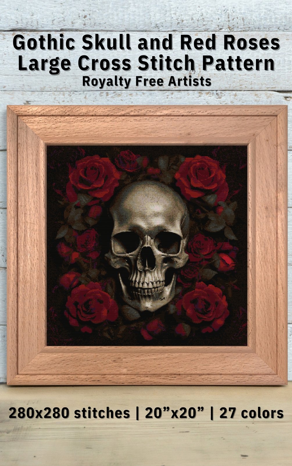 Gothic Skull and Red Roses Large Cross Stitch Pattern  280x280 stitches  20x20 inches  50.8x50.8 cm